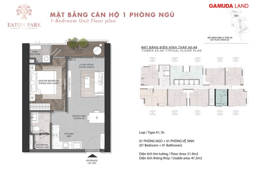 Layout thiết kế căn hộ 1 Phòng ngủ, Loại A1.1b tòa tháp A5 và A6 dự án Eaton Park