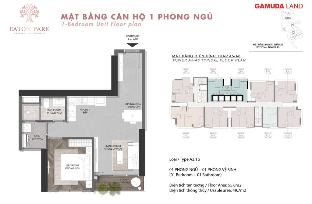 Layout thiết kế căn hộ 1 Phòng ngủ, Loại A3.1b tòa tháp A5 và A6 dự án Eaton Park