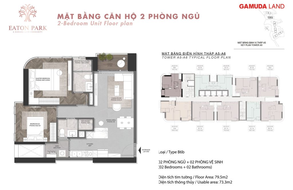 Layout thiết kế căn hộ 2 Phòng ngủ, Loại B6b tòa tháp A5 và A6 dự án Eaton Park