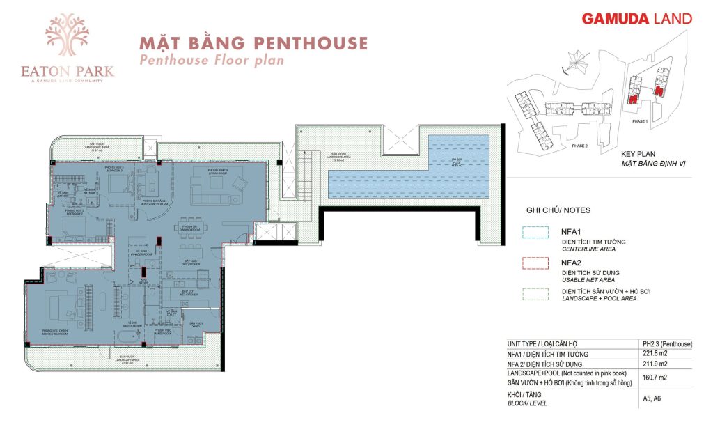 Layout thiết kế căn hộ Penthouse, Loại PH2.3 tòa tháp A5 và A6 dự án Eaton Park